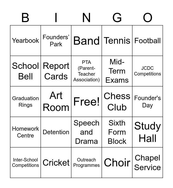 This bingo card has a free space and 44 words: Graduation Ceremony, Chapel Service, Devotions, Inter-School Competitions, Debate Club, Choir, Band, Track and Field, Football, Cricket, Tennis, Chess Club, Speech and Drama, Detention, Peer Counsellors, Outreach Programmes, Community Service, Graduation Rings, School Anthem, JCDC Competitions, Founders’ Park, Historic Archway, School Magazine, Yearbook, Alumni Association, Founder's Day, Prize-Giving Ceremony, Teachers’ Lounge, Sixth Form Block, Homework Centre, School Library, Study Hall, Computer Lab, Science Fair, Art Room, Home Economics Lab, Guidance Counsellor, Principal’s Office, PTA (Parent-Teacher Association), School Bell, Mid-Term Exams, End-of-Year Exams, Report Cards and Uniform Inspection.