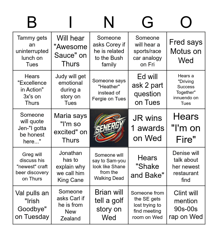 This bingo card has a free space and 24 words: Jonathan has to explain why we call him King Cane, Someone asks Carl if he is from New Zealand, Someone says "Heather" instead of Fergie on Tues, Val pulls an "Irish Goodbye" on Tuesday, Fred says Motus on Wed, Tammy gets an uninterrupted lunch on Tues, Hears "Excellence in Action" 3x's on Thurs, Will hear "Awesome Sauce" on Thurs, JR wins 1 awards on Wed, Someone will say to Sam-you look like Shane from the Walking Dead, Ed will ask 2 part question on Tues, Someone will quote Jen-"I gotta be honest here...", Hears "Shake and Bake", Denise will talk about her newest restaurant find, Judy will get emotional during a story on Tues, Someone from the SE gets lost trying to find meeting room on Wed, Hears "I'm on Fire", Someone asks Corey if he is related to the Bush family, Hears a "Driving Success Together" innuendo on Tues, Maria says "I'm so excited" on Thurs, Clint will mention 90s-00s rap on Wed, Greg will discuss his "newest" craft beer discovery on Thurs, Someone will hear a sports/race car analogy on Fri and Brian will tell a golf story on Wed.