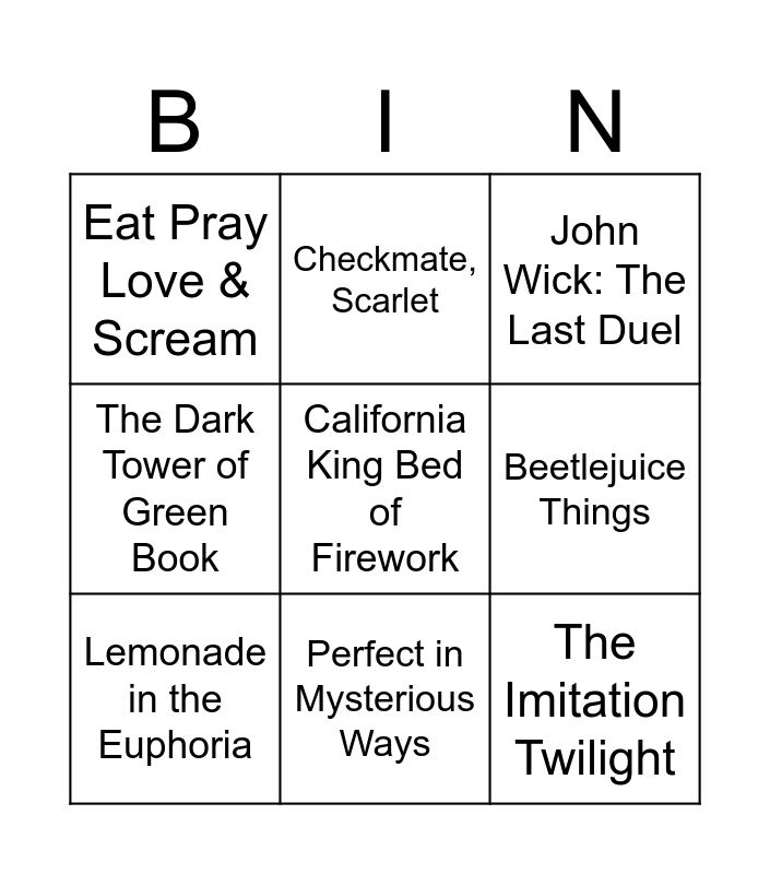 This bingo card has 22 words: Thor's Fight Club, A Few Good Delusions, Checkmate, Scarlet, The Devil Wears Black Swan, Beetlejuice Things, Lemonade in the Euphoria, Eat Pray Love & Scream, John Wick: The Last Duel, Call Me by Your Name, Dark Knight, Dumb and Anchored, The Imitation Twilight, The Dark Tower of Green Book, Beauty and the Wolf of Wall Street, Catch Me If You Can in Riverdale, Sin City full of Salt, The Martian Tenet, A Star Is Born Wicked, Cry Me a River of Purpose, Get Lucky on 22 Jump Street, California King Bed of Firework, Perfect in Mysterious Ways and Arthur & The Perks of Being a Wallflower.