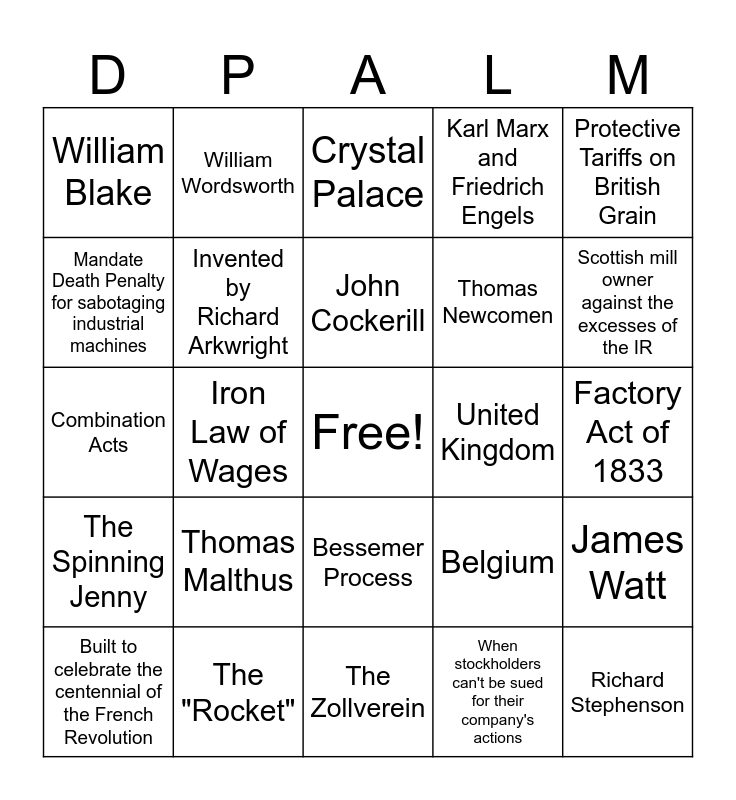 This bingo card has a free space and 24 words: Thomas Malthus, The "Rocket", John Cockerill, Built to celebrate the centennial of the French Revolution, Protective Tariffs on British Grain, William Blake, Mandate Death Penalty for sabotaging industrial machines, William Wordsworth, United Kingdom, Bessemer Process, Thomas Newcomen, Combination Acts, Belgium, James Watt, Invented by Richard Arkwright, When stockholders can't be sued for their company's actions, Factory Act of 1833, Crystal Palace, Scottish mill owner against the excesses of the IR, Iron Law of Wages, Richard Stephenson, The Spinning Jenny, Karl Marx and Friedrich Engels and The Zollverein.