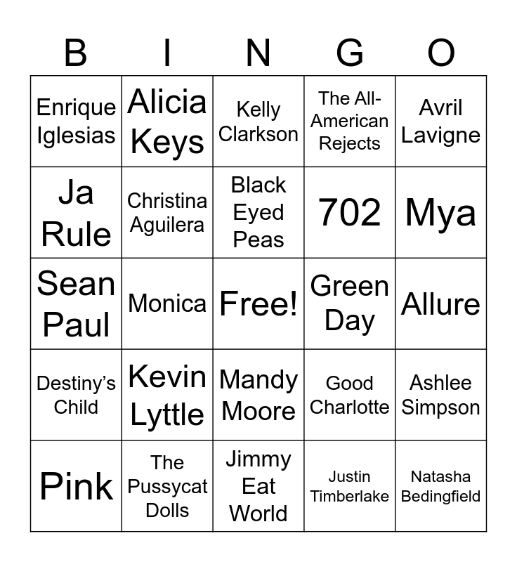 This bingo card has a free space and 34 words: Britney Spears, Justin Timberlake, Mariah Carey, Gwen Stefani, Destiny’s Child, Christina Aguilera, Avril Lavigne, Pink, Alicia Keys, Ahanti, Black Eyed Peas, Kelly Clarkson, Ciara, Missy Elliot, Green Day, Mya, The Pussycat Dolls, Sean Paul, Kevin Lyttle, Good Charlotte, Mandy Moore, 3 Doors Down, Enrique Iglesias, Allure, Jimmy Eat World, Natasha Bedingfield, The All-American Rejects, Hillary Duff, 702, Ja Rule, Jessica Simpson, Monica, Ashlee Simpson and Usher.