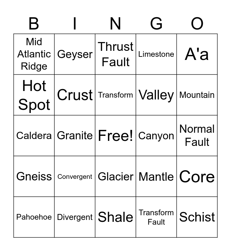 This bingo card has a free space and 24 words: Convergent, Divergent, Transform, Pahoehoe, A'a, Mid Atlantic Ridge, Hot Spot, Geyser, Canyon, Glacier, Valley, Caldera, Mantle, Core, Crust, Transform Fault, Normal Fault, Thrust Fault, Mountain, Granite, Schist, Gneiss, Limestone and Shale.