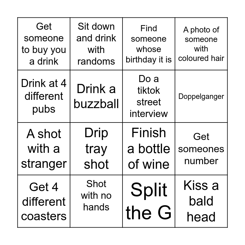 This bingo card has 16 words: Shot with no hands, Get someones number, Find someone whose birthday it is, Get someone to buy you a drink, A shot with a stranger, Sit down and drink with randoms, Finish a bottle of wine, Split the G, Drink at 4 different pubs, Drink a buzzball, Get 4 different coasters, A photo of someone with coloured hair, Drip tray shot, Doppelganger, Do a tiktok street interview and Kiss a bald head.