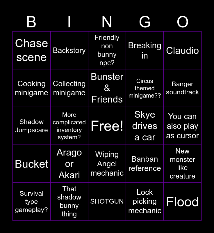 This bingo card has a free space and 24 words: Arago or Akari, That shadow bunny thing, Bunster & Friends, Survival type gameplay?, Claudio, Chase scene, Cooking minigame, Backstory, Skye drives a car, Wiping Angel mechanic, Circus themed minigame??, Shadow Jumpscare, Banban reference, New monster like creature, Collecting minigame, Lock picking mechanic, You can also play as cursor, Friendly non bunny npc?, Banger soundtrack, More complicated inventory system?, Flood, Bucket, Breaking in and SHOTGUN.