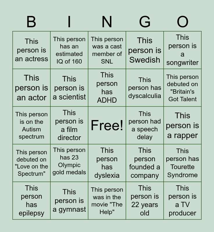 This bingo card has a free space and 24 words: This person has 23 Olympic gold medals, This person is a gymnast, This person has ADHD, This person has epilepsy, This person is a songwriter, This person is an actress, This person is an actor, This person has an estimated IQ of 160, This person had a speech delay, This person has dyslexia, This person has dyscalculia, This person is on the Autism spectrum, This person founded a company, This person has Tourette Syndrome, This person is a scientist, This person is 22 years old, This person is a rapper, This person was a cast member of SNL, This person debuted on "Britain's Got Talent, This person is a film director, This person is a TV producer, This person debuted on "Love on the Spectrum", This person is Swedish and This person was in the movie "The Help".