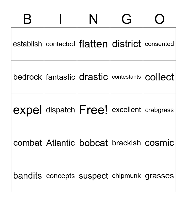 This bingo card has a free space and 24 words: Atlantic, concepts, drastic, bandits, consented, establish, bedrock, contacted, excellent, bobcat, contestants, expel, brackish, cosmic, fantastic, chipmunk, crabgrass, flatten, collect, dispatch, grasses, combat, district and suspect.