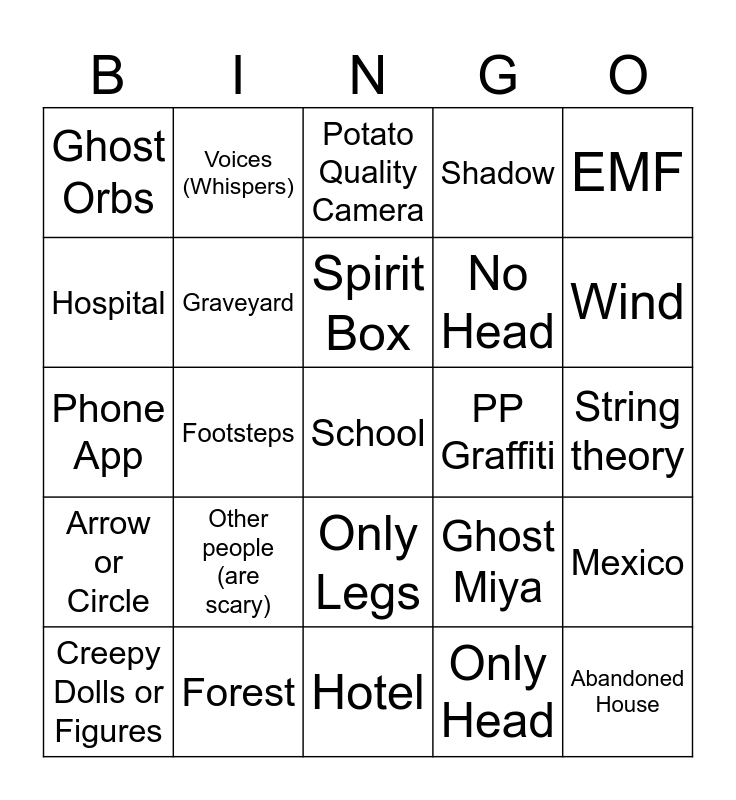 This bingo card has 25 words: Other people (are scary), Hotel, Spirit Box, Creepy Dolls or Figures, EMF, Ghost Orbs, Hospital, Voices (Whispers), PP Graffiti, Only Legs, No Head, Phone App, Ghost Miya, Mexico, Graveyard, Abandoned House, String theory, Potato Quality Camera, Wind, Footsteps, School, Forest, Arrow or Circle, Shadow and Only Head.