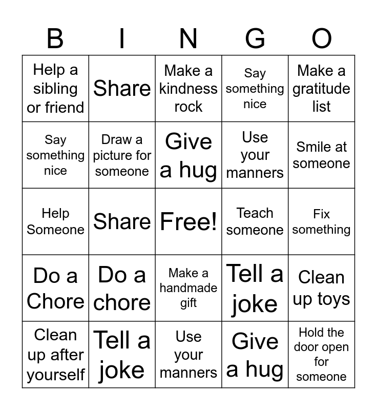 This bingo card has a free space and 24 words: Do a chore, Tell a joke, Give a hug, Clean up after yourself, Make a gratitude list, Help a sibling or friend, Say something nice, Share, Teach someone, Make a handmade gift, Use your manners, Help Someone, Tell a joke, Clean up toys, Draw a picture for someone, Give a hug, Fix something, Make a kindness rock, Smile at someone, Share, Hold the door open for someone, Do a Chore, Say something nice and Use your manners.