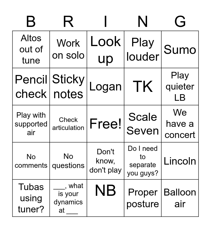 This bingo card has a free space and 37 words: Trumpets out of tune, Corral everyday, Trumpets, stop talking, Sticky notes, Lincoln, No questions, Logan, Flutes out of tune, Sumo, Crescendo, Check articulation, Play louder, Balloon air, We have a concert, Pencil check, No comments, Breath together, Play together, Look up, Don't know, don't play, Scale Seven, Altos out of tune, Play quieter LB, Tubas using tuner?, NB, "Last time", Proper posture, Work on solo, Stop right before entrance, Color of the Day, Dynamics are relative, Decrescendo, ___, what is your dynamics at ___, Play with supported air, I don't have the music in front of me, Do I need to separate you guys?, TK and Good morning band (more than once).