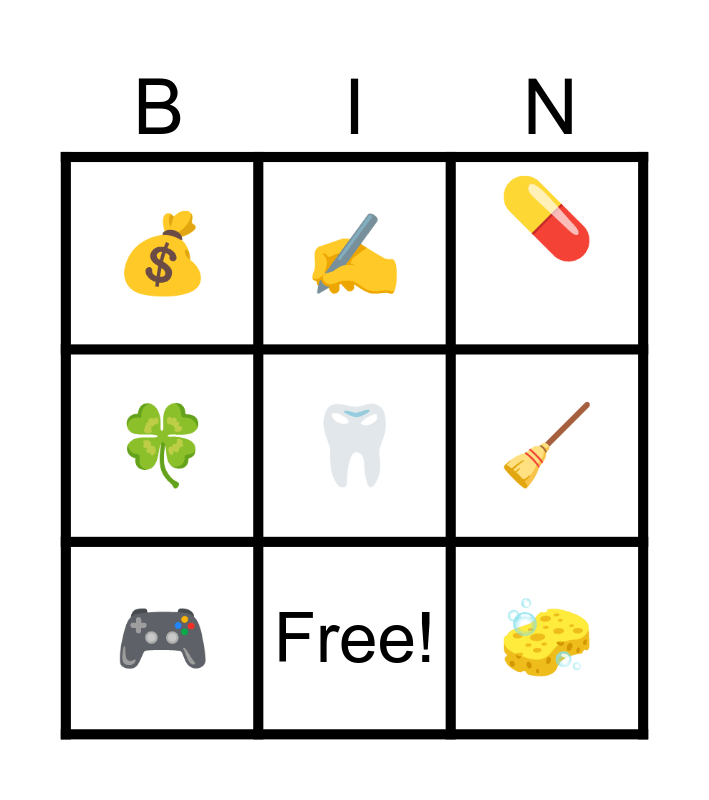 This bingo card has 10 words: Free!, ๐, ๐ฐ, ๐ฆท, ๐, ๐ฎ, โ๏ธ, ๐งโ๐ณ, ๐งน and ๐งฝ.