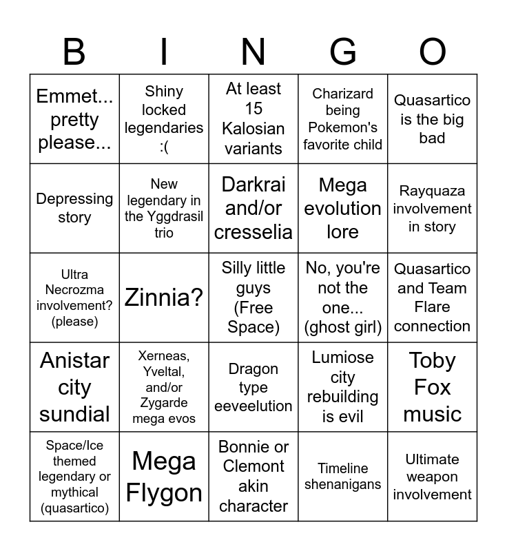 This bingo card has a free space and 24 words: Xerneas, Yveltal, and/or Zygarde mega evos, Mega Flygon, Darkrai and/or cresselia, Space/Ice themed legendary or mythical (quasartico), Quasartico is the big bad, Emmet... pretty please..., Depressing story, Shiny locked legendaries :(, No, you're not the one... (ghost girl), Dragon type eeveelution, Mega evolution lore, Ultra Necrozma involvement? (please), Lumiose city rebuilding is evil, Toby Fox music, New legendary in the Yggdrasil trio, Timeline shenanigans, Quasartico and Team Flare connection, At least 15 Kalosian variants, Rayquaza involvement in story, Zinnia?, Ultimate weapon involvement, Anistar city sundial, Charizard being Pokemon's favorite child and Bonnie or Clemont akin character.