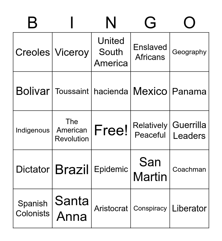 This bingo card has a free space and 29 words: Spanish Colonists, Mestizos, The American Revolution, Hidalgo, Creoles, United South America, Toussaint, Brazil, Relatively Peaceful, Santa Anna, Guerrilla Leaders, Liberator, Aristocrat, Conspiracy, Panama, Colonization, Epidemic, Dictator, Geography, Indigenous, San Martin, French Guiana, Mexico, Bolivar, Enslaved Africans, Viceroy, Coachman, hacienda and ambush.
