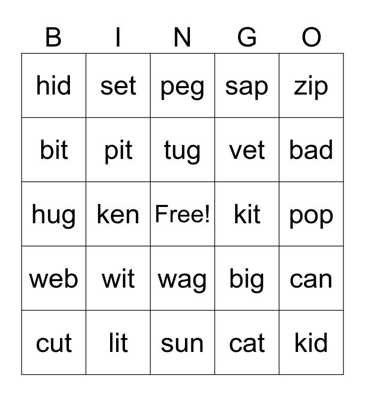This bingo card has a free space and 24 words: wit, lit, tug, cut, zip, hid, bit, set, kit, wag, vet, hug, big, can, pit, cat, pop, peg, bad, ken, kid, web, sap and sun.