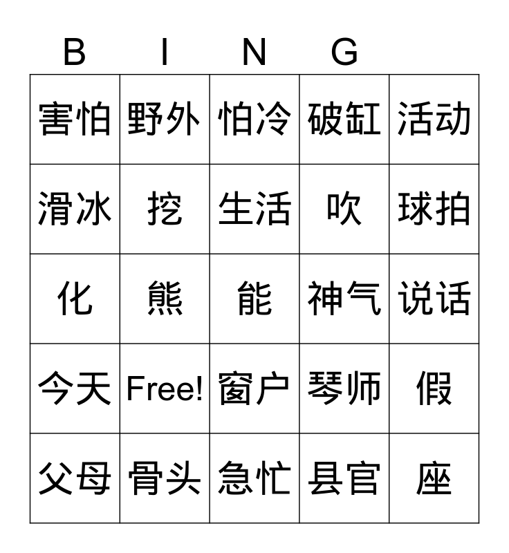 This bingo card has 25 words: Free!, 急忙, 生活, 父母, 活动, 害怕, 滑冰, 野外, 神气, 窗户, 吹, 化, 琴师, 假, 挖, 座, 说话, 怕冷, 球拍, 熊, 能, 骨头, 今天, 破缸 and 县官.