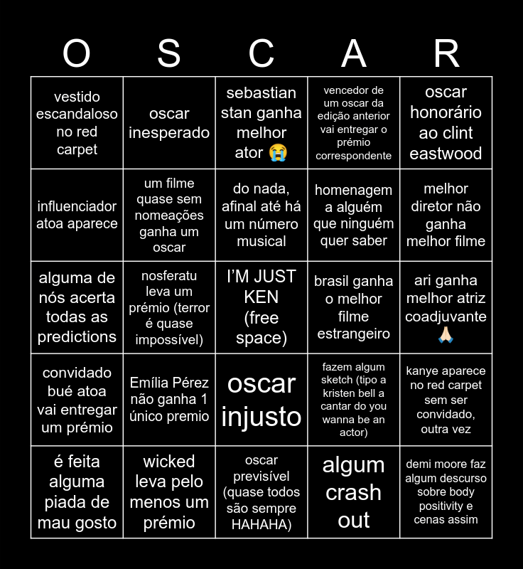 This bingo card has a free space and 24 words: Emília Pérez não ganha 1 único premio, wicked leva pelo menos um prémio, do nada, afinal até há um número musical, é feita alguma piada de mau gosto, oscar honorário ao clint eastwood, vestido escandaloso no red carpet, influenciador atoa aparece, oscar inesperado, brasil ganha o melhor filme estrangeiro, oscar injusto, homenagem a alguém que ninguém quer saber, alguma de nós acerta todas as predictions, fazem algum sketch (tipo a kristen bell a cantar do you wanna be an actor), kanye aparece no red carpet sem ser convidado, outra vez, um filme quase sem nomeações ganha um oscar, algum crash out, ari ganha melhor atriz coadjuvante 🙏🏻, sebastian stan ganha melhor ator 😭, melhor diretor não ganha melhor filme, nosferatu leva um prémio (terror é quase impossível), demi moore faz algum descurso sobre body positivity e cenas assim, convidado bué atoa vai entregar um prémio, vencedor de um oscar da edição anterior vai entregar o prémio correspondente and oscar previsível (quase todos são sempre HAHAHA).