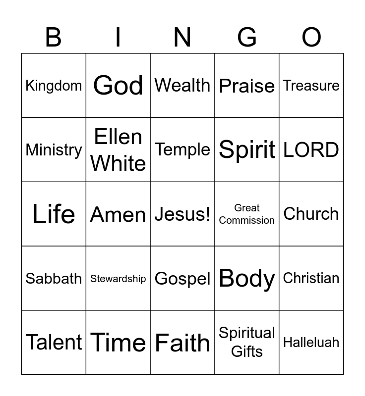 This bingo card has a free space and 24 words: Stewardship, Time, Temple, Talent, Treasure, Kingdom, Ministry, God, Great Commission, Gospel, Spirit, Life, Body, Christian, Ellen White, Spiritual Gifts, Church, Wealth, LORD, Amen, Halleluah, Sabbath, Praise and Faith.