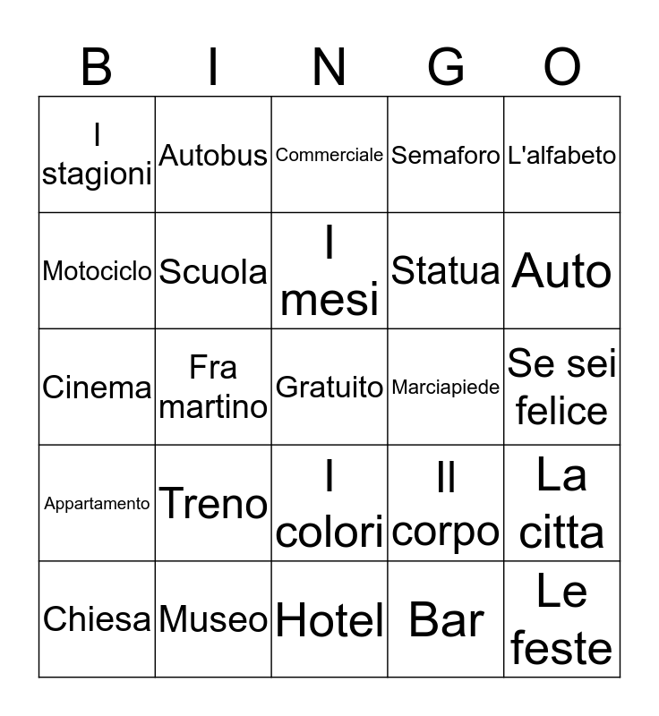 This bingo card has a free space and 28 words: La citta, Mercato, Statua, Bar, Motociclo, Commerciale, Autobus, Appartamento, Marciapiede, Chiesa, Cinema, Semaforo, Museo, Hotel, Auto, Bicicletta, Treno, Scuola, I mesi, I colori, I stagioni, I giorni, Le feste, Fra martino, Se sei felice, Il corpo, L'alfabeto and I numeri.