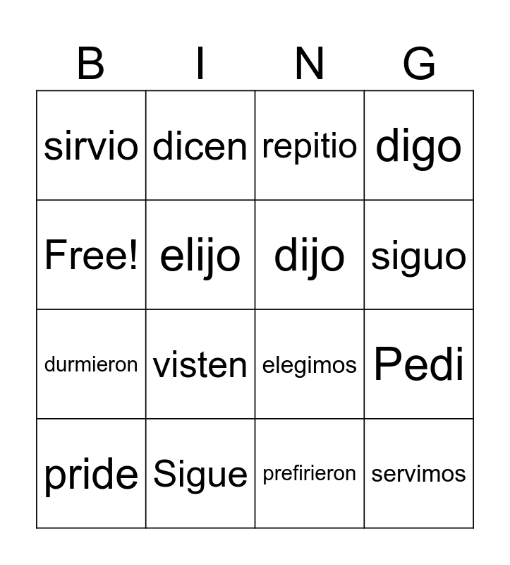 This bingo card has 16 words: Sigue, Pedi, repitio, sirvio, durmieron, dicen, elegimos, prefirieron, Free!, elijo, pride, digo, visten, siguo, dijo and servimos.