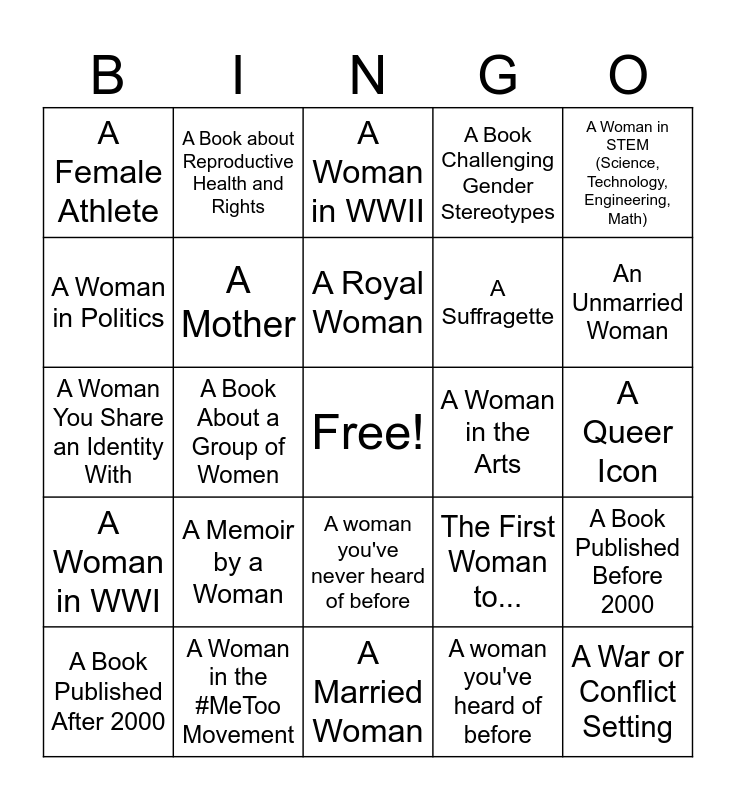 This bingo card has a free space and 26 words: A woman you've never heard of before, A woman you've heard of before, A Royal Woman, A Woman in the #MeToo Movement, A Woman in STEM (Science, Technology, Engineering, Math), A Female Athlete, A Woman in Politics, A Book about Reproductive Health and Rights, A Queer Icon, The First Woman to..., A Suffragette, A Woman You Share an Identity With, A Book Published Before 2000, A Book Published After 2000, A Book About a Group of Women, A Non-Western Woman's Story, A Book Challenging Gender Stereotypes, A Woman in WWI, A Woman in WWII, A War or Conflict Setting, An Unmarried Woman, A Married Woman, A Woman in the Arts, A Memoir by a Woman, A Mother and A Childless Woman.