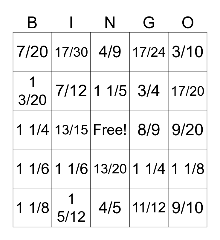 This bingo card has a free space and 28 words: 1 1/8, 7/8, 3/4, 11/12, 1 3/20, 4/9, 17/30, 1 1/6, 8/9, 1 1/8, 1 1/4, 17/24, 1 5/12, 4/5, 17/20, 5/6, 1 1/6, 7/12, 1 1/5, 13/20, 7/20, 19/20, 9/10, 13/15, 9/20, 1 1/4, 3/10 and 1 7/10.