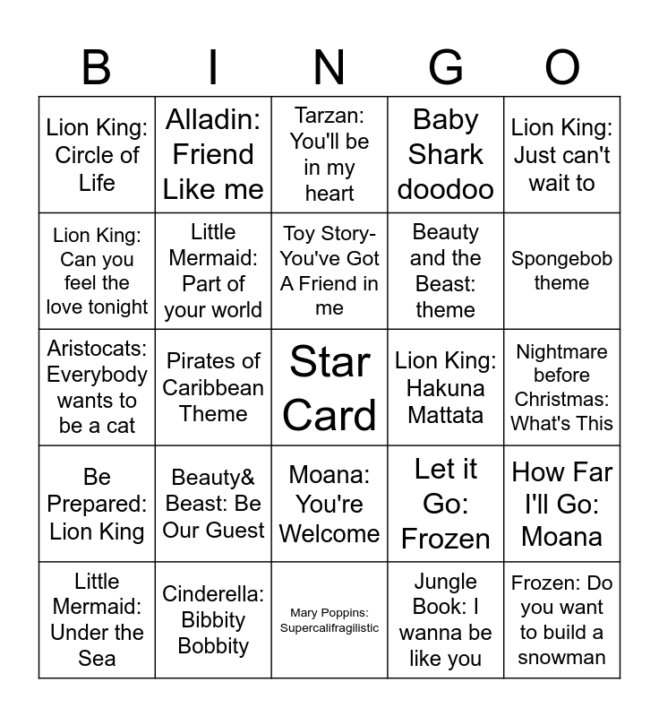 This bingo card has a free space and 24 words: Little Mermaid: Under the Sea, Beauty& Beast: Be Our Guest, Toy Story- You've Got A Friend in me, Jungle Book: I wanna be like you, Lion King: Just can't wait to, Lion King: Circle of Life, Alladin: Friend Like me, Tarzan: You'll be in my heart, Lion King: Hakuna Mattata, Nightmare before Christmas: What's This, Aristocats: Everybody wants to be a cat, Little Mermaid: Part of your world, Let it Go: Frozen, How Far I'll Go: Moana, Lion King: Can you feel the love tonight, Cinderella: Bibbity Bobbity, Mary Poppins: Supercalifragilistic, Baby Shark doodoo, Spongebob theme, Be Prepared: Lion King, Pirates of Caribbean Theme, Moana: You're Welcome, Beauty and the Beast: theme and Frozen: Do you want to build a snowman.