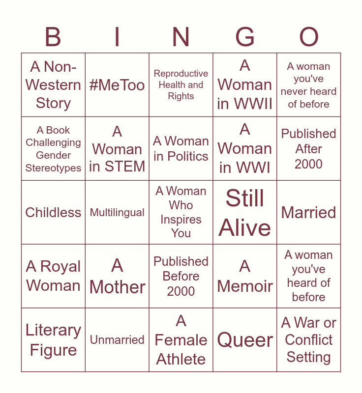 This bingo card has a free space and 32 words: Queer, Immigrant / Refugee, Multilingual, The First Woman to..., A Royal Woman, A Woman in STEM, A woman you've never heard of before, A woman you've heard of before, #MeToo, A Suffragette, A Woman in Politics, Reproductive Health and Rights, A Woman You Share an Identity With, Dead, Still Alive, Fictional Retelling, Literary Figure, Childless, Published Before 2000, A Mother, A Memoir, A Woman in the Arts, Married, Unmarried, A War or Conflict Setting, A Woman in WWII, A Woman in WWI, A Book Challenging Gender Stereotypes, A Non-Western Story, A Female Athlete, A Book About a Group of Women and Published After 2000.