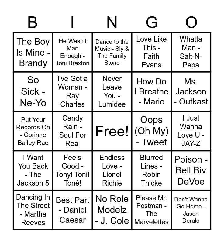 This bingo card has a free space and 99 words: Always On Time - Ja Rule, Don't Let Go (Love) - En Vogue, Rolling in the Deep - Adele, Dance to the Music - Sly & The Family Stone, Blinding Lights - The Weeknd, Frontin' - Pharrell Williams, Somebody's Watching Me - Rockwell, I'll Make Love To You - Boyz ll Men, It's Not Right But It's Okay - Whitney Houston, Lady - D'Angelo, Blame It - Jamie Foxx, This Is How We Do It - Montell Jordan, Halo - Beyoncé, Endless Love - Lionel Richie, No Scrubs - TLC, The Boy Is Mine - Brandy, He Wasn't Man Enough - Toni Braxton, Crazy - Gnarls Barkley, Unwritten - Natasha Bedingfield, Thinkin Bout You - Frank Ocean, Love On The Brain - Rihanna, No Diggity - Blackstreet, Love Don't Cost a Thing - Jennifer Lopez, September - Earth Wind & Fire, I Will Survive - Gloria Gaynor, Poison - Bell Biv DeVoe, Never Leave You - Lumidee, We Belong Together - Mariah Carey, What You Want - Mase, I (Do) Cherish You - 98°, No Role Modelz - J. Cole, Please Mr. Postman - The Marvelettes, Forever Your Girl - Paula Abdul, Stand By Me - Ben E. King, Candy Rain - Soul For Real, Put Your Records On - Corinne Bailey Rae, Just the Two of Us - Grover Washington, Where the Party At - Jagged Edge, Lean on Me - Bill Withers, Feels Good - Tony! Toni! Toné!, Easy - Commodores, Ms. Jackson - Outkast, Love Like This - Faith Evans, Best Part - Daniel Caesar, Billie Jean - Michael Jackson, Dilemma - Nelly, Redbone - Childish Gambino, Bad Habit - Steve Lacy, Water - Tyla, I Heard It Through The Grapevine - Marvin Gaye, Buy U a Drank - T-Pain, Don't Wanna Go Home - Jason Derulo, Blurred Lines - Robin Thicke, Doo Wop (That Thing) - Ms. Lauryn Hill, This Will Be - Natalie Cole, Fallin' - Alicia Keys, Respect - Aretha Franklin, I Got You - James Brown, Peaches & Cream - 112, My Girl - The Temptations, My Boo - USHER, Stay With Me -Sam Smith, Super Freak - Rick James, Best of My Love - The Emotions, Uptown Funk - Bruno Mars, Whatta Man - Salt-N-Pepa, Snooze - SZA, Trip - Ella Mai, Outlaws - Alessia Cara, I Want You Back - The Jackson 5, Upside Down - Diana Ross, How Do I Breathe - Mario, So Sick - Ne-Yo, Heart of a Woman - Summer Walker, All For You - Janet Jackson, Location - Khalid, I've Got a Woman - Ray Charles, The Way I Are Timbaland, Stop! In The Name Of Love - The Supremes, Soul Man - Sam & Dave, Oops (Oh My) - Tweet, One In A Million - Aaliyah, 1 Thing - Amerie, Signed Sealed Delivered - Stevie Wonder, Like a Boy - Ciara, ocean eyes - Billie Eilish, Killing Me Softly With His Song - Fugees, I Wanna Love You - Akon, I Just Wanna Love U - JAY-Z, Dancing In The Street - Martha Reeves, Genie In a Bottle - Christina Aguilera, Back To Black - Amy Winehouse, MILLION DOLLAR BABY - Tommy Richman, I've Got the Music in Me - Kiki Dee, Say My Name - Destiny's Child, Do You Love Me - The Contours, Family Affair - Mary J. Blige, Glamorous - Fergie and Uh Huh - B2K.