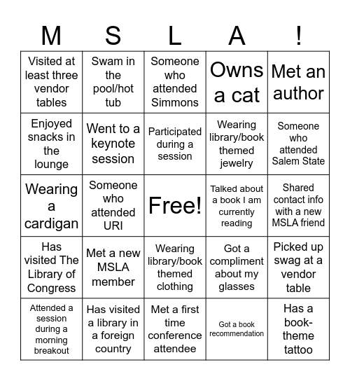 This bingo card has a free space and 25 words: Met a new MSLA member, Met a first time conference attendee, Participated during a session, Attended a session during a morning breakout, Met an author, Visited at least three vendor tables, Enjoyed snacks in the lounge, Swam in the pool/hot tub, Talked about a book I am currently reading, Wearing library/book themed clothing, Wearing library/book themed jewelry, Wearing a cardigan, Got a compliment about my glasses, Picked up swag at a vendor table, Went to a keynote session, Talked to someone in my region, Shared contact info with a new MSLA friend, Someone who attended Simmons, Someone who attended Salem State, Someone who attended URI, Has a book-theme tattoo, Has visited a library in a foreign country, Has visited The Library of Congress, Owns a cat and Got a book recommendation.