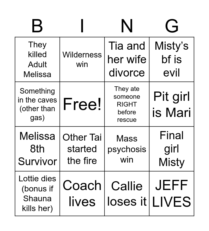 This bingo card has 16 words: Coach lives, Final girl Misty, Tia and her wife divorce, They killed Adult Melissa, Melissa 8th Survivor, Wilderness win, Mass psychosis win, Callie loses it, Something in the caves (other than gas), Free!, Lottie dies (bonus if Shauna kills her), Misty’s bf is evil, Other Tai started the fire, Pit girl is Mari, They ate someone RIGHT before rescue and JEFF LIVES.