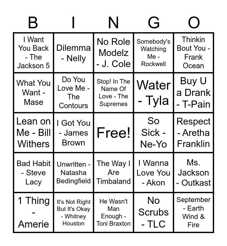 This bingo card has a free space and 99 words: Best of My Love - The Emotions, Frontin' - Pharrell Williams, All For You - Janet Jackson, No Role Modelz - J. Cole, Halo - Beyoncé, ocean eyes - Billie Eilish, Lady - D'Angelo, Don't Let Go (Love) - En Vogue, Genie In a Bottle - Christina Aguilera, Where the Party At - Jagged Edge, Put Your Records On - Corinne Bailey Rae, No Diggity - Blackstreet, Whatta Man - Salt-N-Pepa, The Way I Are Timbaland, Don't Wanna Go Home - Jason Derulo, I Want You Back - The Jackson 5, Dilemma - Nelly, Poison - Bell Biv DeVoe, Trip - Ella Mai, My Girl - The Temptations, MILLION DOLLAR BABY - Tommy Richman, Killing Me Softly With His Song - Fugees, Best Part - Daniel Caesar, Love On The Brain - Rihanna, Forever Your Girl - Paula Abdul, Ms. Jackson - Outkast, Stop! In The Name Of Love - The Supremes, Easy - Commodores, Billie Jean - Michael Jackson, This Will Be - Natalie Cole, He Wasn't Man Enough - Toni Braxton, No Scrubs - TLC, Oops (Oh My) - Tweet, My Boo - USHER, I Got You - James Brown, Lean on Me - Bill Withers, Always On Time - Ja Rule, Super Freak - Rick James, I Heard It Through The Grapevine - Marvin Gaye, Unwritten - Natasha Bedingfield, Like a Boy - Ciara, Buy U a Drank - T-Pain, Somebody's Watching Me - Rockwell, It's Not Right But It's Okay - Whitney Houston, The Boy Is Mine - Brandy, Crazy - Gnarls Barkley, Location - Khalid, I've Got the Music in Me - Kiki Dee, Blurred Lines - Robin Thicke, Uptown Funk - Bruno Mars, Love Don't Cost a Thing - Jennifer Lopez, September - Earth Wind & Fire, I Wanna Love You - Akon, Heart of a Woman - Summer Walker, Glamorous - Fergie, I've Got a Woman - Ray Charles, We Belong Together - Mariah Carey, How Do I Breathe - Mario, This Is How We Do It - Montell Jordan, One In A Million - Aaliyah, Soul Man - Sam & Dave, Back To Black - Amy Winehouse, Redbone - Childish Gambino, Candy Rain - Soul For Real, Snooze - SZA, Thinkin Bout You - Frank Ocean, Peaches & Cream - 112, I Will Survive - Gloria Gaynor, Stand By Me - Ben E. King, Bad Habit - Steve Lacy, Family Affair - Mary J. Blige, Water - Tyla, What You Want - Mase, Feels Good - Tony! Toni! Toné!, Outlaws - Alessia Cara, I (Do) Cherish You - 98°, Do You Love Me - The Contours, Just the Two of Us - Grover Washington, I'll Make Love To You - Boyz ll Men, Endless Love - Lionel Richie, So Sick - Ne-Yo, Please Mr. Postman - The Marvelettes, Dancing In The Street - Martha Reeves, Love Like This - Faith Evans, Uh Huh - B2K, Dance to the Music - Sly & The Family Stone, Doo Wop (That Thing) - Ms. Lauryn Hill, Rolling in the Deep - Adele, Respect - Aretha Franklin, 1 Thing - Amerie, Signed Sealed Delivered - Stevie Wonder, Blame It - Jamie Foxx, Upside Down - Diana Ross, Stay With Me -Sam Smith, Say My Name - Destiny's Child, Fallin' - Alicia Keys, Blinding Lights - The Weeknd, I Just Wanna Love U - JAY-Z and Never Leave You - Lumidee.
