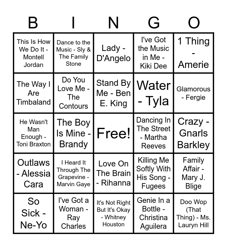 This bingo card has a free space and 99 words: Candy Rain - Soul For Real, Stop! In The Name Of Love - The Supremes, I Will Survive - Gloria Gaynor, Lady - D'Angelo, Just the Two of Us - Grover Washington, Upside Down - Diana Ross, Best of My Love - The Emotions, Heart of a Woman - Summer Walker, My Girl - The Temptations, Say My Name - Destiny's Child, I (Do) Cherish You - 98°, I Got You - James Brown, How Do I Breathe - Mario, Love On The Brain - Rihanna, I Want You Back - The Jackson 5, This Is How We Do It - Montell Jordan, Dance to the Music - Sly & The Family Stone, Stay With Me -Sam Smith, Rolling in the Deep - Adele, Billie Jean - Michael Jackson, Bad Habit - Steve Lacy, Back To Black - Amy Winehouse, Snooze - SZA, Lean on Me - Bill Withers, Poison - Bell Biv DeVoe, Family Affair - Mary J. Blige, Stand By Me - Ben E. King, Don't Wanna Go Home - Jason Derulo, We Belong Together - Mariah Carey, Forever Your Girl - Paula Abdul, It's Not Right But It's Okay - Whitney Houston, Genie In a Bottle - Christina Aguilera, Soul Man - Sam & Dave, Fallin' - Alicia Keys, The Boy Is Mine - Brandy, He Wasn't Man Enough - Toni Braxton, Thinkin Bout You - Frank Ocean, Easy - Commodores, Uh Huh - B2K, I Heard It Through The Grapevine - Marvin Gaye, Buy U a Drank - T-Pain, Glamorous - Fergie, I've Got the Music in Me - Kiki Dee, I've Got a Woman - Ray Charles, Unwritten - Natasha Bedingfield, Halo - Beyoncé, Respect - Aretha Franklin, I'll Make Love To You - Boyz ll Men, Ms. Jackson - Outkast, I Wanna Love You - Akon, Love Don't Cost a Thing - Jennifer Lopez, Doo Wop (That Thing) - Ms. Lauryn Hill, Killing Me Softly With His Song - Fugees, Uptown Funk - Bruno Mars, Oops (Oh My) - Tweet, Endless Love - Lionel Richie, This Will Be - Natalie Cole, Location - Khalid, Best Part - Daniel Caesar, One In A Million - Aaliyah, Dilemma - Nelly, No Scrubs - TLC, Whatta Man - Salt-N-Pepa, Don't Let Go (Love) - En Vogue, Love Like This - Faith Evans, 1 Thing - Amerie, Blurred Lines - Robin Thicke, My Boo - USHER, No Diggity - Blackstreet, Outlaws - Alessia Cara, Like a Boy - Ciara, Water - Tyla, The Way I Are Timbaland, Put Your Records On - Corinne Bailey Rae, Super Freak - Rick James, September - Earth Wind & Fire, Do You Love Me - The Contours, Please Mr. Postman - The Marvelettes, I Just Wanna Love U - JAY-Z, Feels Good - Tony! Toni! Toné!, Dancing In The Street - Martha Reeves, Blinding Lights - The Weeknd, What You Want - Mase, Always On Time - Ja Rule, All For You - Janet Jackson, Signed Sealed Delivered - Stevie Wonder, Redbone - Childish Gambino, Blame It - Jamie Foxx, Crazy - Gnarls Barkley, So Sick - Ne-Yo, Where the Party At - Jagged Edge, Peaches & Cream - 112, ocean eyes - Billie Eilish, No Role Modelz - J. Cole, MILLION DOLLAR BABY - Tommy Richman, Somebody's Watching Me - Rockwell, Never Leave You - Lumidee, Frontin' - Pharrell Williams and Trip - Ella Mai.