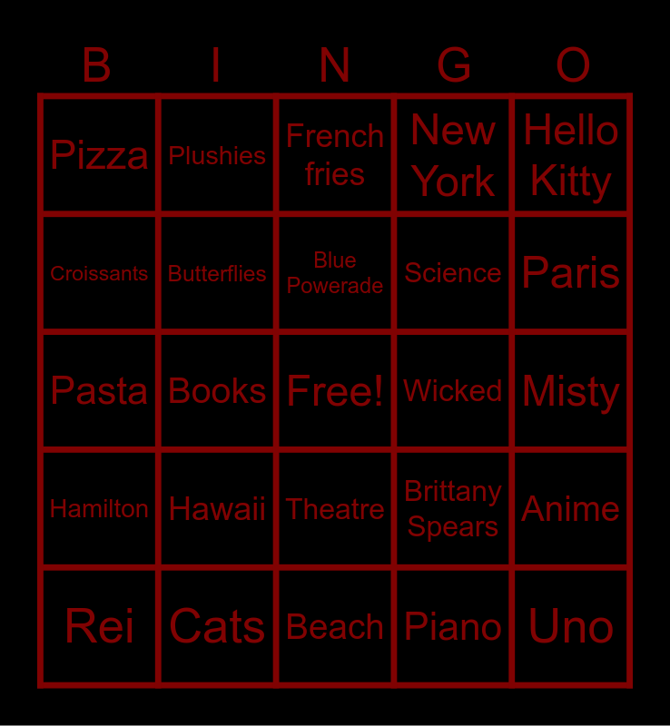 This bingo card has a free space and 69 words: Lilly, Misty, Itto, Dogs, Cats, Japan, New York, China, Hello Kitty, Strawberry shortcake, Anime, Manga, Pizza, French fries, Barnes and Noble, Books, Theatre, Science, English, Hamilton, Wicked, Brittany Spears, Paris, Barcelona, Broadway, Roller coasters, Ice skating, Swimming, Piano, Sleeping, Plushies, Halloween, Pumpkins, Mariah Carey, Michael Jackson, Slime, Amusement parks, Chocolate cake, Croissants, San Francisco, Hawaii, Uno, LuLu, Christmas, Danmei, Rei, Vyn, Sylus, Heaven Officials Blessing, Butterflies, Blue Powerade, Oreo ice cream, Boba Tea, Beach, Pink, Purple, Sloths, Acting, Reading, Pasta, Pancakes, French toast, Thin Mints, Jolly Ranchers, Rubber ducks, Jeeps, Dum Dum lollipops, Grilled cheese and K-Pop.