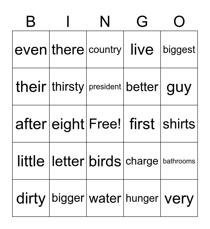This bingo card has a free space and 24 words: letter, bigger, president, dirty, biggest, even, their, there, first, birds, better, after, charge, bathrooms, thirsty, hunger, shirts, country, guy, eight, very, little, live and water.