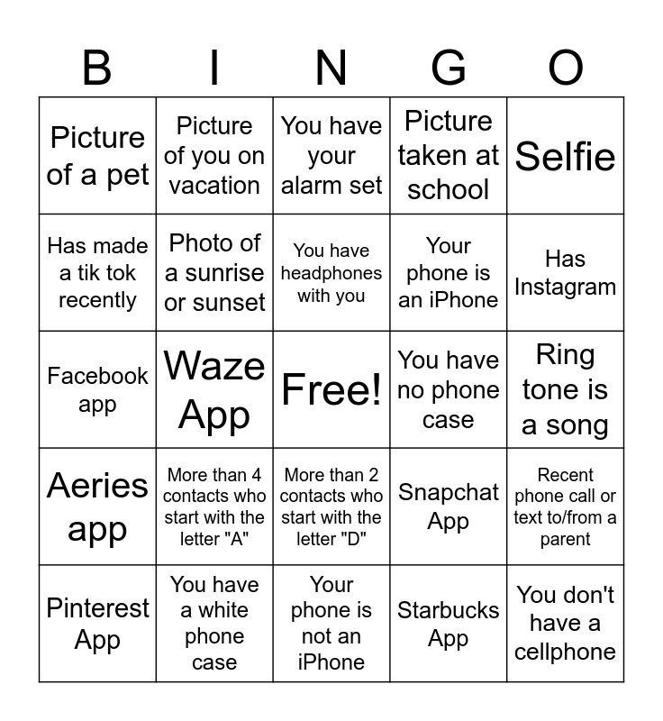This bingo card has a free space and 24 words: Pinterest App, More than 4 contacts who start with the letter "A", You have headphones with you, Starbucks App, Selfie, Picture of a pet, Picture of you on vacation, You have your alarm set, You have no phone case, Ring tone is a song, Facebook app, Photo of a sunrise or sunset, Snapchat App, Recent phone call or text to/from a parent, Has made a tik tok recently, You have a white phone case, Your phone is not an iPhone, Picture taken at school, Has Instagram, Aeries app, Waze App, More than 2 contacts who start with the letter "D", Your phone is an iPhone and You don't have a cellphone.