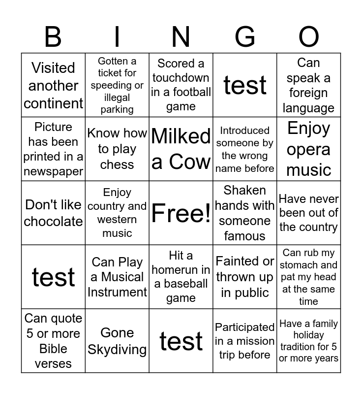 This bingo card has a free space and 24 words: Can Play a Musical Instrument, Gone Skydiving, Milked a Cow, Can quote 5 or more Bible verses, Can speak a foreign language, Visited another continent, Picture has been printed in a newspaper, Gotten a ticket for speeding or illegal parking, Shaken hands with someone famous, Hit a homerun in a baseball game, Introduced someone by the wrong name before, Don't like chocolate, Fainted or thrown up in public, Can rub my stomach and pat my head at the same time, Know how to play chess, Participated in a mission trip before, Have never been out of the country, Scored a touchdown in a football game, Enjoy opera music, Enjoy country and western music, Have a family holiday tradition for 5 or more years, test, test and test.