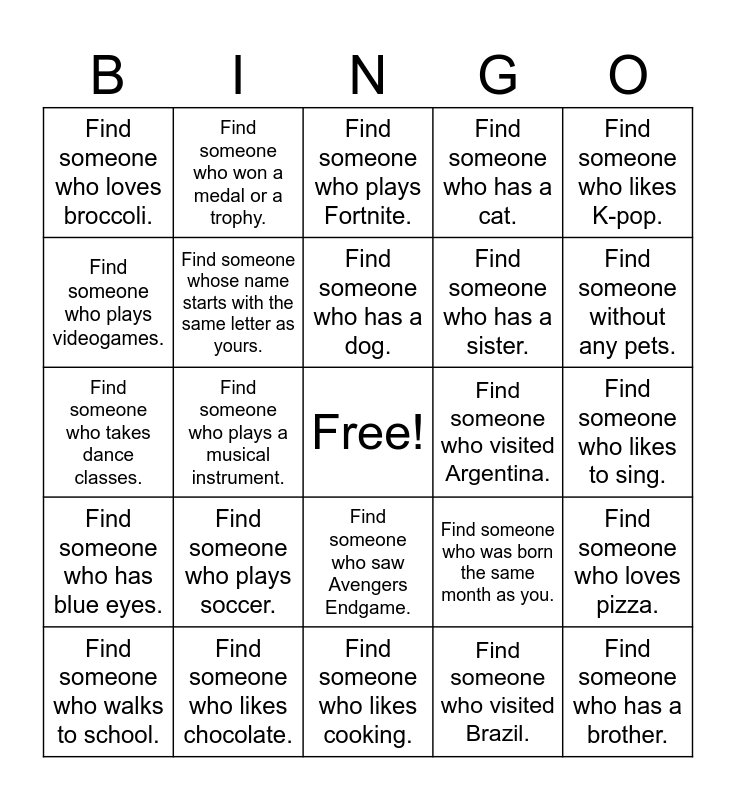 This bingo card has a free space and 24 words: Find someone who plays soccer., Find someone who likes chocolate., Find someone who has a dog., Find someone who walks to school., Find someone who likes K-pop., Find someone who loves broccoli., Find someone who plays videogames., Find someone who won a medal or a trophy., Find someone who visited Argentina., Find someone who saw Avengers Endgame., Find someone who has a sister., Find someone who takes dance classes., Find someone who was born the same month as you., Find someone who loves pizza., Find someone whose name starts with the same letter as yours., Find someone who visited Brazil., Find someone who likes to sing., Find someone who plays Fortnite., Find someone without any pets., Find someone who plays a musical instrument., Find someone who has a brother., Find someone who has blue eyes., Find someone who has a cat. and Find someone who likes cooking..