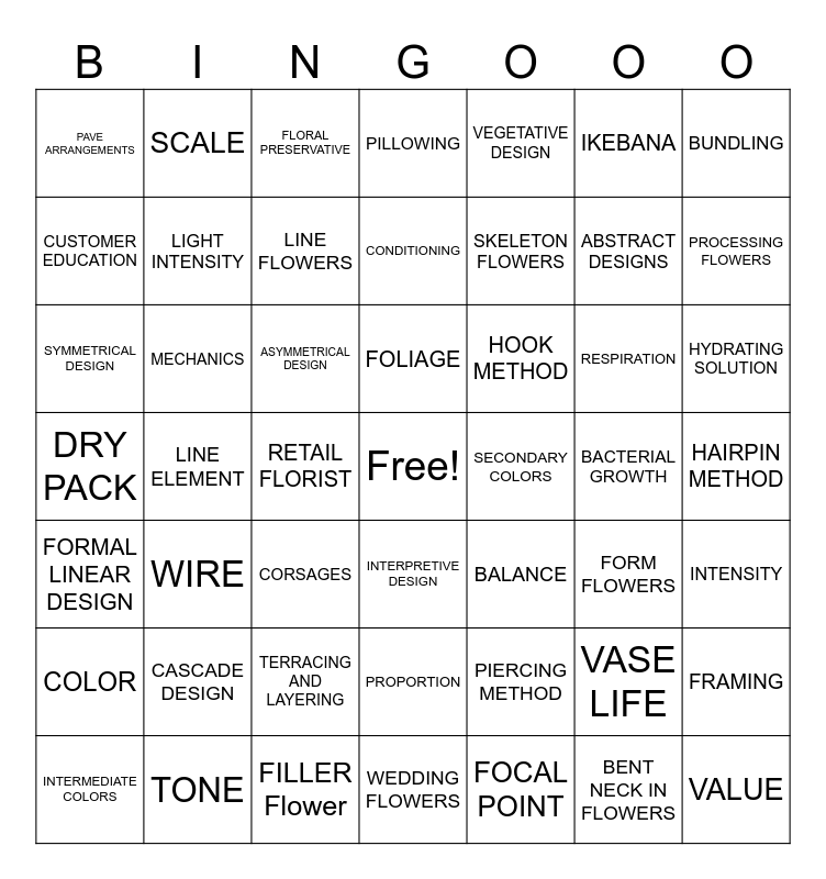 This bingo card has a free space and 60 words: FILLER, DRY PACK, PROCESSING, MECHANICS, RETAIL FLORIST, VASE LIFE, BUNDLING, PHOTOSYNTHESIS, LIGHT INTENSITY, FRAMING, PILLOWING, TERRACING AND LAYERING, IKEBANA, CORSAGES, BENT NECK IN FLOWERS, PAVE ARRANGEMENTS, ABSTRACT DESIGNS, VEGETATIVE DESIGN, WATERFALL DESIGN, CUSTOMER EDUCATION, PROCESSING FLOWERS, FLORAL PRESERVATIVE, HYDRATING SOLUTION, RESPIRATION, TRANSPIRATION, INTERPRETIVE DESIGN, FORMAL LINEAR DESIGN, PARALLEL DESIGN, LINE FLOWERS, FORM FLOWERS, MASS FLOWERS, CASCADE DESIGN, FOCAL POINT, PRIMARY COLORS, SCALE, SECONDARY COLORS, PROPORTION, SKELETON FLOWERS, BALANCE, CONDITIONING, PIERCING METHOD, ASYMMETRICAL DESIGN, SYMMETRICAL DESIGN, ROUND DESIGNS, HOOK METHOD, HAIRPIN METHOD, INTERMEDIATE COLORS, FILLER Flower, WEDDING FLOWERS, FOLIAGE, LINE ELEMENT, FORM, COLOR, BACTERIAL GROWTH, WIRE, INTENSITY, TONE, SHADE, VALUE and TINT.