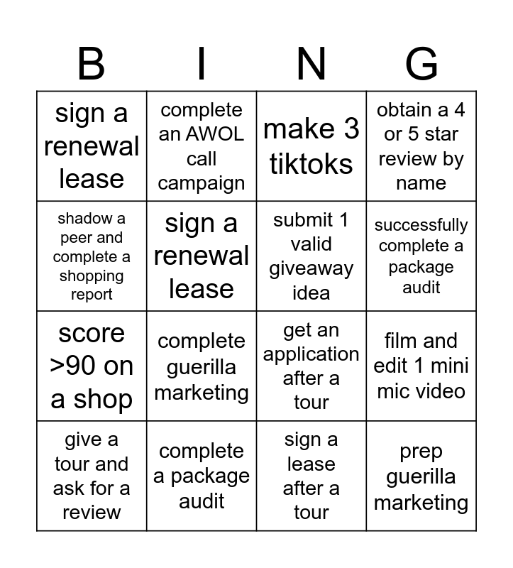 This bingo card has 18 words: complete guerilla marketing, prep guerilla marketing, make 3 tiktoks, sign a renewal lease, get an application after a tour, obtain a 4 or 5 star review by name, give a tour and ask for a review, complete an AWOL call campaign, successfully complete a package audit, score >90 on a shop, sign a lease after a tour, shadow a peer and complete a shopping report, film and edit 1 mini mic video, sign a renewal lease, submit 1 valid giveaway idea, give someone bonusly points, complete a package audit and plan an event.