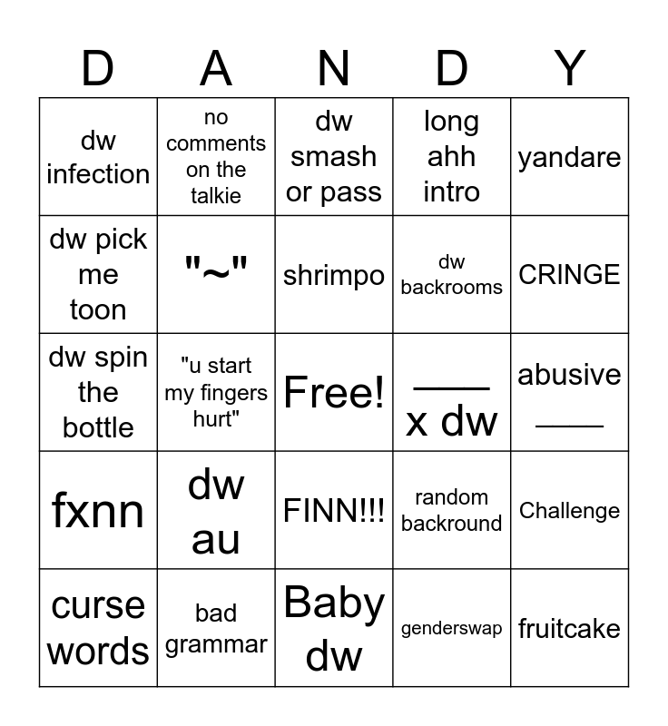 This bingo card has a free space and 49 words: moonflower, fruitcake, freaky _____, Baby dw, dw au, random ahh ship, no comments on the talkie, somethin that isint dw, dw pick me toon, dw hates/ loves u, "~", long ahh intro, Challenge, random backround, more then 1000 connecters, shellyvision, shrimpo, ___ x dw, game moment talkie, yandare, "u start my fingers hurt", genderswap, dw infection, dw backrooms, twisted, CRINGE, curse words, no talking, FINN!!!, fxnn, dw school, ur new toon, only mains, emoji, bad grammar, boring, shiping finn with anyone...., somethin funny, abusive ____, dw sleepover, dw roadtrip, dandy, Christmas toons, *healing sounds*, dw spin the bottle, dw smash or pass, dw t/d, just sus and dw killer au.