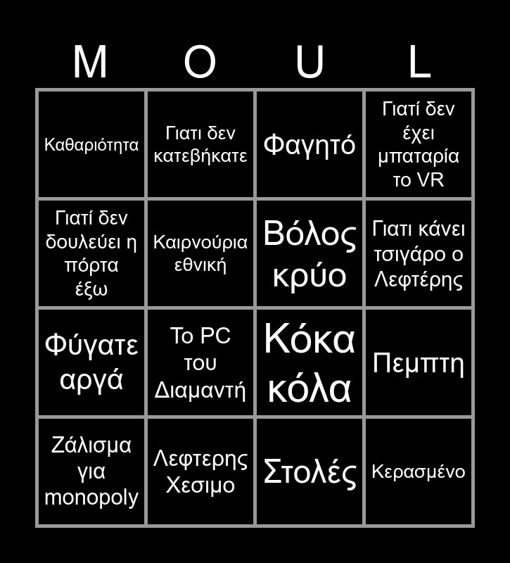 This bingo card has 16 words: Λεφτερης Χεσιμο, Πεμπτη, Φαγητό, Καθαριότητα, Φύγατε αργά, Γιατι δεν κατεβήκατε, Κόκα κόλα, Στολές, Γιατί δεν δουλεύει η πόρτα έξω, Καιρνούρια εθνική, Ζάλισμα για monopoly, Γιατί δεν έχει μπαταρία το VR, Το PC του Διαμαντή, Γιατι κάνει τσιγάρο ο Λεφτέρης, Βόλος κρύο and Κερασμένο.