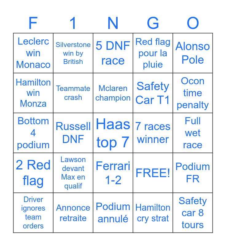 This bingo card has 25 words: Lawson devant Max en qualif, Podium annulé, Mclaren champion, Driver ignores team orders, Alonso Pole, Leclerc win Monaco, Hamilton win Monza, Silverstone win by British, 7 races winner, Ferrari 1-2, Safety Car T1, Bottom 4 podium, FREE!, Podium FR, Teammate crash, Safety car 8 tours, Full wet race, 5 DNF race, Ocon time penalty, Russell DNF, Haas top 7, Annonce retraite, 2 Red flag, Red flag pour la pluie and Hamilton cry strat.