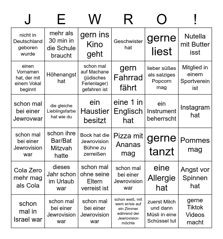 This bingo card has 41 words: schon mal bei einer Jewrovision war, die gleiche Lieblingsfarbe hat wie du, im gleichen Monat Geburtstag hat wie du, Geschwister hat, gerne tanzt, Angst vor Spinnen hat, nicht in Deutschland geboren wurde, mehr als drei Sprachen spricht, gern ins Kino geht, gern Fahrrad fährt, lieber süßes als salziges Popcorn mag, Mitglied in einem Sportverein ist, einen Vornamen hat, der mit einem Vokal beginnt, schon ihre Bar/Bat Mitzvah hatte, schon mal auf Machane (jüdisches Ferienlager) gefahren ist, eine 1 in Englisch hat, zuerst Milch und dann Müsli in eine Schüssel tut, Nutella mit Butter isst, Cola Zero mehr mag als Cola, Höhenangst hat, ein Haustier besitzt, Pizza mit Ananas mag, eine Allergie hat, Pommes mag, schon mal in Israel war, dieses Jahr schon im Urlaub war, schon mal ohne seine Eltern verreist ist, gerne mit dem Zug fährt, gerne liest, gerne Tiktok Videos macht, auf dem Schulweg Musik hört, mehr als 30 min in die Schule braucht, Bock hat die Jewrovision Bühne zu zerreißen, schon weiß, mit wem er/sie auf ein Zimmer während der Jewrovision möchte, ein Instrument beherrscht, Instagram hat, schon mal bei einer Jewrovwar, schon mal bei einer Jewrovision war, schon mal bei einer Jewrovision war, schon mal bei einer Jewrovision war and schon mal bei einer Jewrovision war.