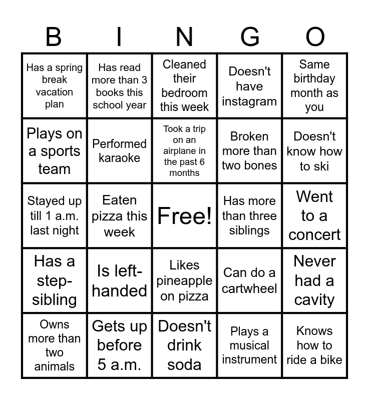 This bingo card has a free space and 24 words: Is left-handed, Gets up before 5 a.m., Took a trip on an airplane in the past 6 months, Owns more than two animals, Same birthday month as you, Has a spring break vacation plan, Plays on a sports team, Has read more than 3 books this school year, Has more than three siblings, Likes pineapple on pizza, Broken more than two bones, Stayed up till 1 a.m. last night, Can do a cartwheel, Never had a cavity, Performed karaoke, Plays a musical instrument, Went to a concert, Cleaned their bedroom this week, Doesn't know how to ski, Eaten pizza this week, Knows how to ride a bike, Has a step-sibling, Doesn't have instagram and Doesn't drink soda.