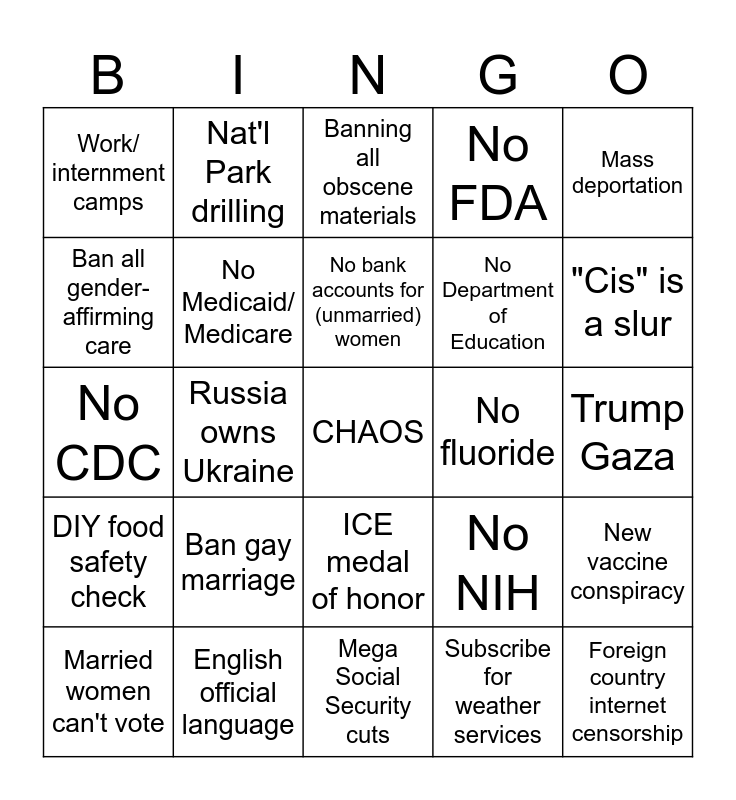 This bingo card has a free space and 24 words: Ban gay marriage, English official language, No bank accounts for (unmarried) women, Married women can't vote, Mass deportation, Work/ internment camps, Ban all gender-affirming care, Nat'l Park drilling, No fluoride, ICE medal of honor, No Department of Education, No CDC, No NIH, New vaccine conspiracy, No Medicaid/ Medicare, Subscribe for weather services, Trump Gaza, Banning all obscene materials, "Cis" is a slur, Russia owns Ukraine, Foreign country internet censorship, DIY food safety check, No FDA and Mega Social Security cuts.