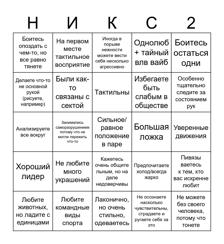 This bingo card has 25 words: Не любите много украшений, Лаконично, но очень стильно, одеваетесь, Тактильны, Любите животных, но ладите с единицами, Боитесь остаться одни, Боитесь опоздать с чем-то, но все равно тянете, Делаете что-то не основной рукой (рисуете, например), На первом месте тактильное восприятие, Большая ложка, Кажетесь очень общите льным, но на деле недоверчивы, Избегаете быть слабым в обществе, Анализируете все вокруг, Предпочитаете холод/всегда жарко, Пивязы ваетесь к тем, кто вас искренне любит, Были как-то связаны с сектой, Не можете без своего человека, потому что тонете, Уверенные движения, Иногда в порыве нежности можете вести себя несколько агрессивно, Особенно тщательно следите за состоянием рук, Занимались саморазрушением потому что не могли пережить что-то, Сильное/равное положение в паре, Любите командные виды спорта, Хороший лидер, Однолюб + тайный влв вайб and Не осознаете насколько чувствительны, страдаете и ругаете себя за это.