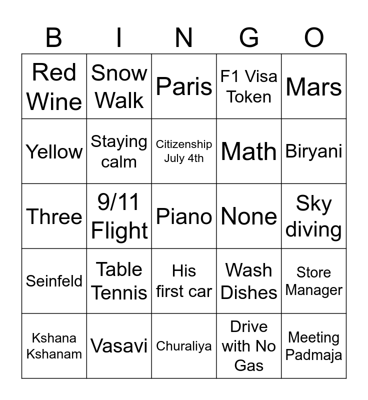 This bingo card has 25 words: Table Tennis, Churaliya, Citizenship July 4th, Kshana Kshanam, Mars, Red Wine, Yellow, Snow Walk, None, His first car, Math, Three, Wash Dishes, Store Manager, Staying calm, Meeting Padmaja, Sky diving, Paris, Biryani, 9/11 Flight, Piano, Vasavi, Seinfeld, F1 Visa Token and Drive with No Gas.