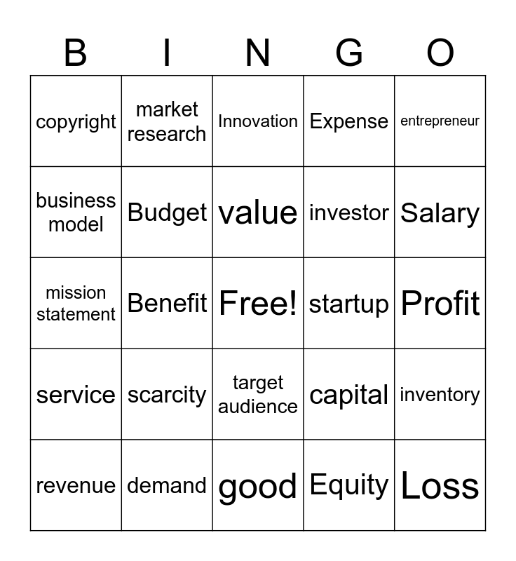 This bingo card has a free space and 24 words: scarcity, demand, value, revenue, entrepreneur, copyright, business model, market research, startup, target audience, investor, mission statement, capital, inventory, Budget, Equity, Profit, Innovation, Salary, Benefit, Loss, service, Expense and good.
