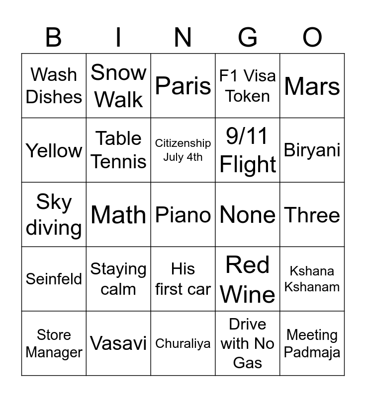 This bingo card has 25 words: Staying calm, Churaliya, Citizenship July 4th, Store Manager, Mars, Wash Dishes, Yellow, Snow Walk, None, His first car, 9/11 Flight, Sky diving, Red Wine, Kshana Kshanam, Table Tennis, Meeting Padmaja, Three, Paris, Biryani, Math, Piano, Vasavi, Seinfeld, F1 Visa Token and Drive with No Gas.
