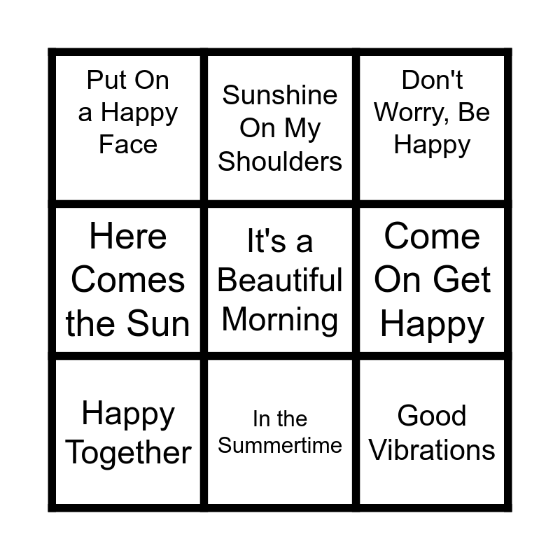 This bingo card has 18 words: It's a Sunshine Day, Sunshine, Lollipops and Rainbows, Don't Worry, Be Happy, Put On a Happy Face, Shout, Here Comes the Sun, I Can See Clearly, Sunshine On My Shoulders, In the Summertime, Good Vibrations, Let The Sunshine In, It's a Beautiful Morning, It's a Good Day, Come On Get Happy, Happy Together, Good Day Sunshine, Hot Hot Hot and Summer Nights.