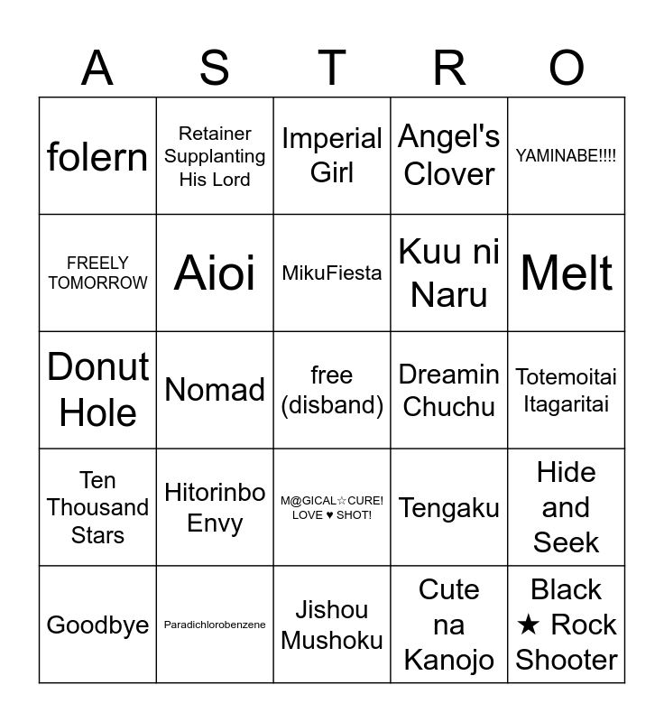This bingo card has a free space and 24 words: Hitorinbo Envy, Paradichlorobenzene, MikuFiesta, Goodbye, YAMINABE!!!!, folern, FREELY TOMORROW, Retainer Supplanting His Lord, Dreamin Chuchu, M@GICAL☆CURE! LOVE ♥ SHOT!, Kuu ni Naru, Donut Hole, Tengaku, Hide and Seek, Aioi, Cute na Kanojo, Totemoitai Itagaritai, Imperial Girl, Melt, Nomad, Black ★ Rock Shooter, Ten Thousand Stars, Angel's Clover and Jishou Mushoku.